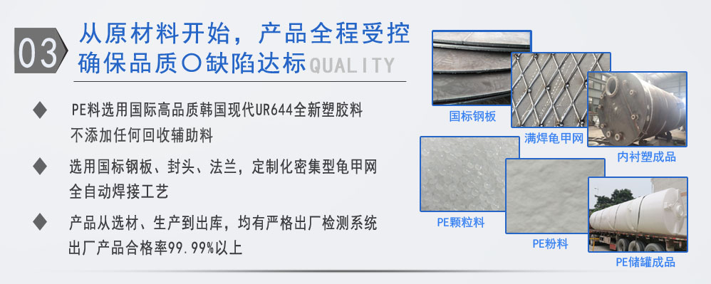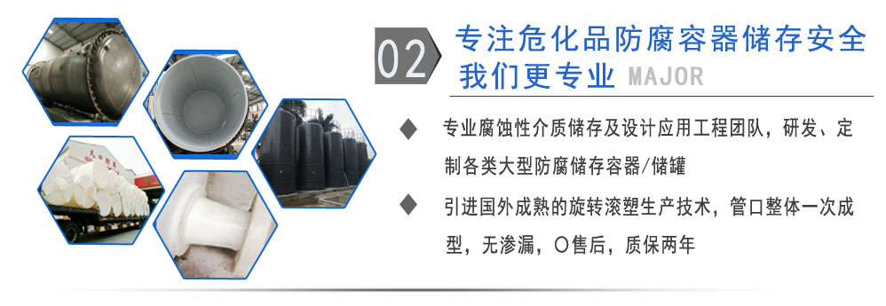 公司有鋼襯塑PE/PO、PE全塑、碳鋼、不銹鋼四大系列100多個品種,專注于常壓儲存容器生產,其產品包括鋼襯塑儲罐、管口一體成型PE儲罐、碳鋼儲罐不銹鋼儲罐、反應釜、攪拌罐、離子交換柱、鋼襯PE/PO儲罐、塑料儲罐、鹽酸儲罐、硫酸儲罐等等。更大限度滿足廣大客戶的各種需求,同時可以根據客戶的需要加工定制各種防腐設備。
